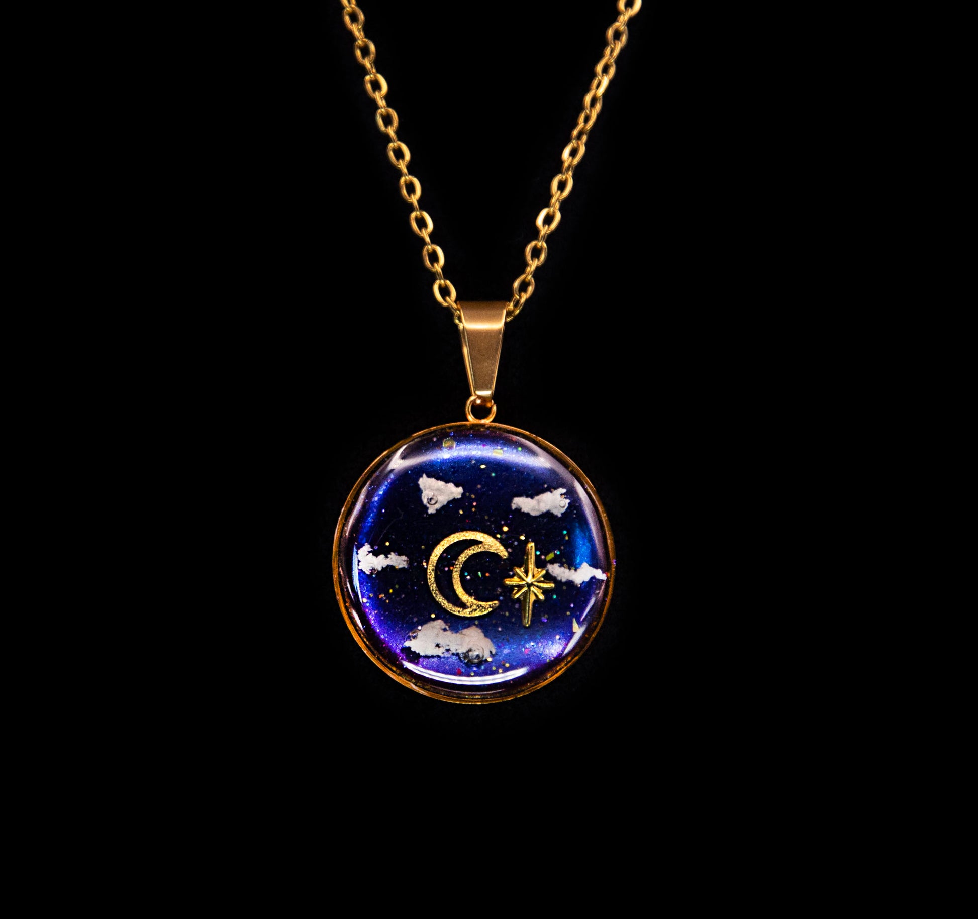 This captivating necklace showcases a golden crescent moon and star, surrounded by soft, floating clouds. The intricate design captures the peaceful allure of a starry night, making it a perfect piece for dreamers and stargazers alike.This necklace is not just a piece of jewelry; it’s a cosmic talisman, inviting you to embrace the wonders of the universe and your place within it. Designed for everyday wear, this necklace is shower-safe, allowing you to keep your connection to the stars close, no matter where your day takes you.