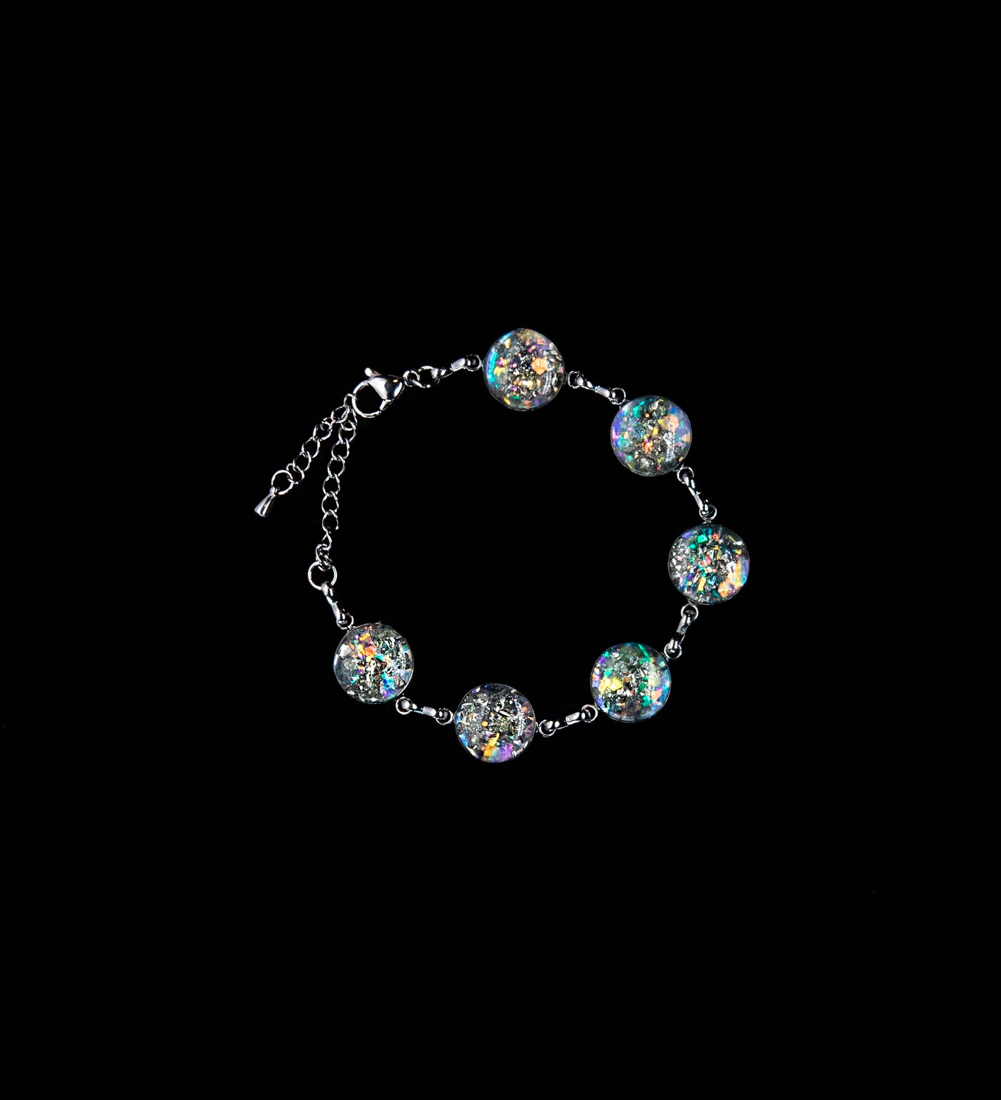 Shine bright with this dazzling bracelet! Featuring iridescent spheres that catch the light from every angle, this piece is perfect for adding a touch of sparkle to your day or night. Wear it solo or stack it for a shimmering statement!